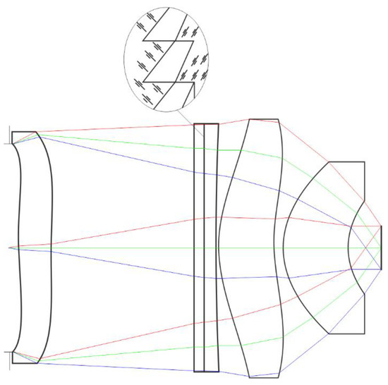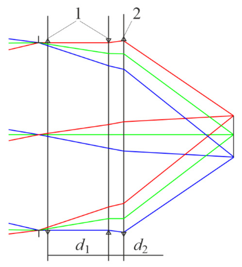 The chromatic aberrations of the optical systems operating in several spectral ranges can be corrected by using only refractive lenses in the optical scheme and by including a diffractive optical element (DOE) in the scheme. Such an element transforms the incident wavefront because of the effect of light diffraction on a relief sawtooth microstructure, which is experienced, for example, on the surface of a refractive lens [8,9]. A significant inverse DOE dispersion, which is characterized by a negative dispersion coefficient, provides tangible advantages to refractive-diffraction schemes. Thus, in particular, a previous study [9] showed that in the double IR range, the required degree of correction of the longitudinal chromatism can be achieved with a three-lens high-aperture refractive-diffractive objective.
