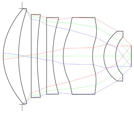 - Optimize the optical scheme that has been obtained as a result of steps 1–5 using a commercial optical design software. Execute the aplanatic condition, and maximize the relative aperture.