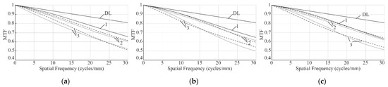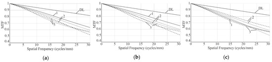 Polychromatic diffraction modulation transfer function (MTF) for the refractive version of the objective: (a), at −40 °C; (b), at 20 °C; (c), at +60 °C. Curved lines DL, Diffraction Limit; 1, at 0°; 2, at 5° half-field angle; and 3, at 9.75° half-field angle (short-dashed curves, sagittal, and long-dashed curves, tangential responses).