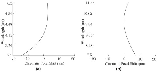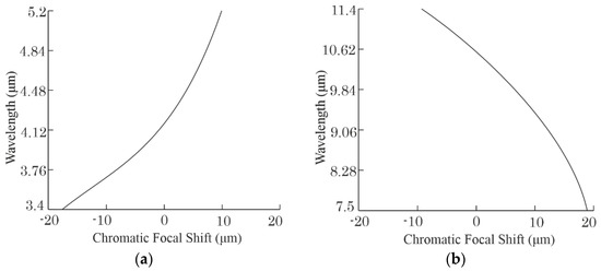Chromatic focal shift for the refractive version of the objective: (a), in MWIR subrange; (b), in LWIR subrange.