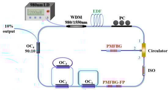 A schematic diagram of the experimental structure for the designed and tested DW-EDFL system is shown in Figure 1. A 980 nm laser diode was used as a pump source to inject into the main ring cavity of the system through a 980/1550 nm wavelength division multiplexer (WDM). The gain medium was a 3 m length of erbium-doped fiber (EDF, YOFC-ED1016, absorption peak at 1532 nm 36 dB/m). The main cavity contained a polarization controller (PC). Through changes in the angular position of the paddles and the polarization state of the light in the laser cavity, the purpose of balancing the gain and loss were achieved. The PMFBG fixed on the fiber displacement stage was connected to the 2-port of the optical circulator which reflected the dual-band channel lasing light into the ring cavity for wavelength primary selection. Through the application of axial strain to the PMFBG, the tunability of the dual-wavelength output was realized. To ensure the unidirectional transmission of the laser light, an optical circulator and an optical isolator (ISO) were adopted.