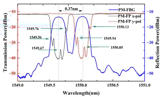 The narrow-band transmission peaks of the PMFBG-FP combined with the MSCs worked together to filter the dense longitudinal modes in the main cavity, ensuring the SLM oscillation. The reflection spectrum of the PMFBG and the transmission spectrum of the PMFBG-FP in the single polarization state of X and Y are shown in Figure 2. The 3 dB bandwidth of the PMFBG reflection peak was 0.22 nm, and the PMFBG-FP has three transmission peaks, which correspond to the tunable laser’s output.