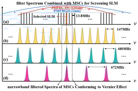 According to the bandwidth of the fiber filter and the length of the main cavity, we set the length of R1 to 43 cm. In addition, the lengths of R2 and R3 in the “8”-shaped cavity were 140 cm and 31 cm, respectively; the corresponding FSRs were 480 MHz, 147 MHz, and 672 MHz, as shown in Figure 4b–d, respectively. Therefore, the effective FSRc of the MSCs is expressed as []