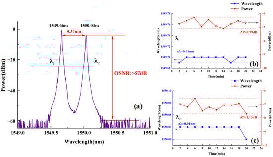 The experiments were performed on an optical table in a clean laboratory with an ambient temperature of 26 °C, and the fused loops of the MSCs were fixed on a vibration isolation plate. Under the condition of 400 mW of pump power (above the pump threshold of 120 mW), the dual-wavelength output and the single-wavelength switchable output could be realized by changing the angle of the PC, which was measured by an ANDO AQ6317B OSA with a resolution of 0.01 nm, as shown in Figure 5a. The two center wavelengths  and  were at 1549.66 nm and 1550.03 nm, with a 3 dB bandwidth of 0.08 nm and an OSNR of more than 57 dB; the wavelength separation was 0.37 nm. Furthermore, we verified the wavelength and power stability of the DW-EDFL at room temperature at two-minute intervals within half an hour, as shown in Figure 5b,c. As can be seen, the maximum fluctuation in the wavelength and power at  and  were 0.01 nm and 0.79 dB, and 0.01 nm and 1.13 dB, respectively.
