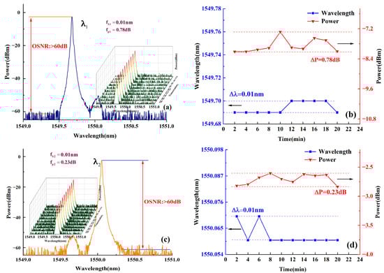 Next, the gain competition caused by simultaneous dual-wavelength lasing and the influence of external environment may affect the output laser’s performance. We further investigated the performance after switching to single-wavelength lasing. At a pump power of 400 mW, by carefully tuning the PC, strong gain competition was introduced at different wavelengths, resulting in stable single-wavelength lasing with OSNR > 60 dB for each wavelength, as shown in Figure 6a,c, illustrating good beam quality. The optical spectrum was scanned 10 times with a 2-min interval between each scan. The experimental results in Figure 6b,d show that the single-wavelength and fluctuations in power at  and  were 0.01 nm with 0.78 dB, and 0.01 nm with 0.23 dB, respectively.