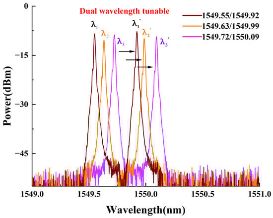 Additionally, when the axial strain was applied to the PMFBG fixed on the optical fiber’s displacement platform, its central wavelength (with a 3 dB bandwidth of 0.22 nm) drifted from about 1549 nm to 1551 nm, ensuring that the central wavelength of the transmission channel coincided with the central wavelength of the reflection channel during the tuning process of applying stress, which is an advantageous position in the gain competition. As shown in Figure 7, the dual-wavelength interval was maintained between 0.36 and 0.37 nm, and the tunable range was 0.17 nm, which basically corresponded to the interval range of the narrow-band transmission peak.