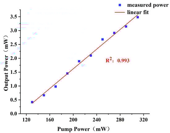 The relationship between the output power of the DW-EDFL at λ1 and the pumping power is shown in Figure 8. The pump threshold of the laser was about 120 mW. When the pumping power was 310 mW, the output power reached 3.48 mW and no power output was saturated. The curve exhibited good linearity (R2~0.993), with a fitted slope efficiency of 1.8%. this shows that the output power of the laser can continue to increase with an increase in the pumping power. Since the mode field mismatch may occur in different types of fiber splices in the laser’s cavity, considering the insertion loss at the flange interface and the splicing loss caused by multiple splices in the MSCs’ structure, the laser’s efficiency may be affected.