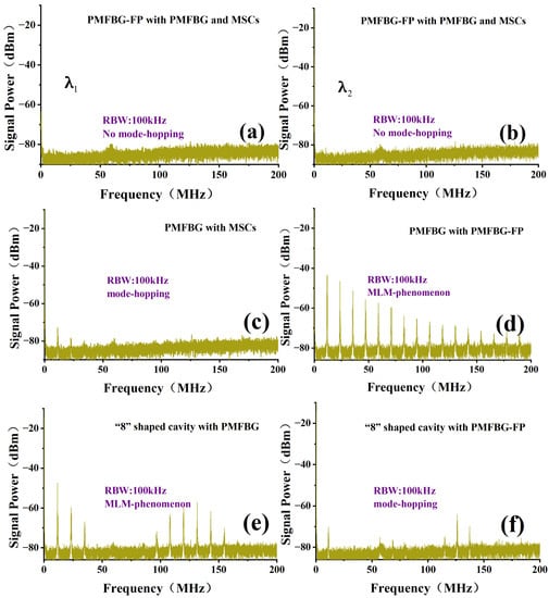 Electrical spectra of the beat signal accumulated within half an hour. (a,b) Beat signals of λ1 and λ2 under the conditions of a combination of narrow-band PMFBG-FPs with PMFBG and MSCs, respectively. (c) Only MSCs were retained without binding the PMFBG-FP. (d) Only the PMFBG-FP was retained without binding the MSCs. (e) Only the “8”-shaped cavity is retained without binding the PMFBG-FP. (f) The “8”-shaped cavity cascade PMFBG-FP.