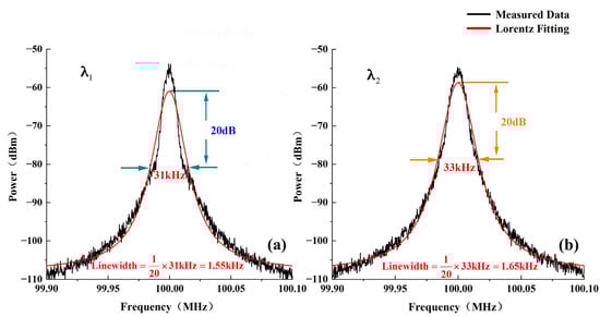 The linewidth of each wavelength of the DW-EDFL was measured using the delayed self-heterodyne interferometer (DSHI) method []. In order to ensure the accuracy of the linewidth’s measurements and obtain a good Lorentzian line shape of the photocurrent spectrum, the system used a 40 km delay fiber, corresponding to a nominal resolution of 4.9 kHz. The 100 MHz acousto-optic modulators (AOMs) were used for frequency shifting, which eliminated the zero frequency interference. Figure 10a,b shows the frequency spectrum (the black curve) and the fitted Lorentzian curves (the red curve) of the  and  wavelengths of the dual-wavelength laser at 100 Hz RBW, respectively. Calculation of the 20 dB bandwidth of the fitting curve showed that the linewidths of the two switchable single-wavelength lasers were 1.55 kHz and 1.65 kHz, respectively, for  and . It is worth noting that due to the limitation of the length of the delay fiber and the unavoidable influence of the current noise of the output laser, the measurement resulted in a broadening of the self-interference spectrum, and the actual linewidth was smaller than the measured value.
