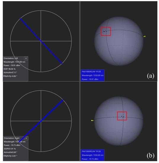 Finally, we measured and analyzed the state of polarization (SOP) characteristics of the proposed laser at the  and  wavelength outputs using a polarization analyzer (Thorlabs, PAX1000IR2/M) [], as shown in Figure 11a,b. During the measurement process, the characteristics were accumulated for 5 min in a stable environment. It can be seen that the SOP of the two wavelengths is nearly orthogonal. The dot trace on the Poincare sphere shows only a fixed point and no drift trace, which indicate that the output laser was in a stable single polarization state. The degree of polarization (DOP) of the fiber laser was studied further, and the polarization degrees of the dual wavelengths  and  reached 96.04% and 101.91%, respectively (the DOP expressed as a percentage here should be less than 100%, as the analytical error of the equipment leads to deviation in the measurements). The results showed that the DW-EDFL exhibited a stable linear polarization state.