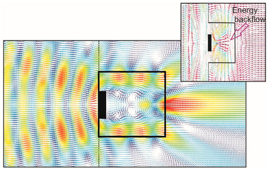 The idea that the performance of simple mesoscale particle-lenses can be enhanced by the anomalous apodization effect without losses of the field enhancement is a new paradigm for the optical community, with wide implications. This effect was first discovered by Minin and Minin [31] for mesoscale single particles of various nonspherical shapes [38,39]. The effect was that the mask introduction in the irradiated particle surface led to a smaller number of optical vortices near the particle shadow-side surface and, thus, allowed reducing the photonic jet beam waist at its intensity increase. This effect was extended to mesoscale phase diffraction gratings. It could be noted that “Mesotronics” studies both an isolated particle and arrays of mesoscale particles, where a building block (unit cell) is comparable or more than the wavelength. In contrast to metasurfaces that consist of subwavelength unit cells and control the wave parameters within a distance much less than the wavelength. Apodization-assisted subdiffraction near-field localization in a two-dimensional phase diffraction grating is caused by a Fano resonance, which occurs in a mesoscale structure due to the effective interaction between the Fabry–Perot interference and the structural Mie resonance [40]. The hybridization of Fabry–Perot and Mie-like modes at the crossing point can lead to the appearance of a quasi-bound state in continuum in mesoscale diffraction gratings with an apodization mask due to the suppression of leakage outside. As it was shown for the first time in [40], such a method provides an important and useful mechanism to suppress radiation and obtain the localized energy with a back flow with an optimized vortex structure inside the phase step of diffraction grating (Figure 2).