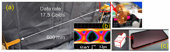 (a) Scheme of the experiment, (b) eye diagram: when the bit-error-rate was the smallest, (c) concept of antenna integrated into a mobile phone. Adapted from [86,87,88,89].