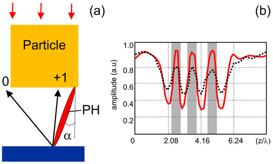 Schematic view of the oblique illumination by a photonic hook (a) and the imaging contrast enhancement of periodic metallic grating (shown in gray) (b) by the illumination of PBJ (black) and PH (red). Adapted from [95].
