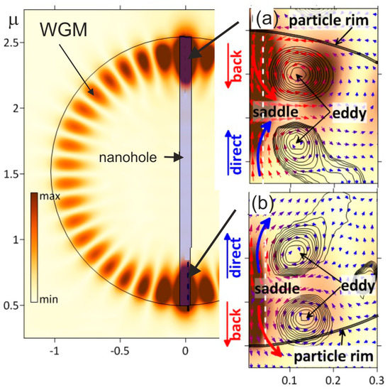 A perforated dielectric sphere, such as a solid particle [110,111,112], supports the excitation of whispering gallery modes (WGMs) [105,113], accompanied by the appearance of optical vortex near the particle boundary similar to topological photonics [114,115] (see Figure 5). Perforation of the spherical particle isolates the energy backflow regions of WGM. It was shown that the Poynting vector fields are strongly turbulent. Several characteristic topological phase defects are distinguished: phase singularity points, around which optical vortices are organized, and vortices located between the saddle zones of the phase field, where the longitudinal Poynting vector component vanishes. The influence of a nanohole in a particle affects the “blue” shift of the resonant wavelength, the drop in the quality factor and the intensity of eigenmodes. However, by a small shift in the illuminating wavelength from the resonant value, it is possible to control the optical vortices position near the nanohole area, which, in turn, makes it possible to control the ratio of the forward and reverse optical energy flows [105]. Interestingly, when detuning the resonance, the reverse energy flow can change for a forward one near the particle surface, it is possible to implement an “optical catapult”. Moreover, when the hole diameter changes, the resonance dispersion effect occurs, i.e., a reverse energy flow and a strong field gradient occur only at Mie resonance.