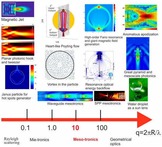 At the same time, dielectric particles with the diameter greater than or even equal to the wavelength (size parameter q of the order of 10 [30,31,32]) occupy a little-studied niche between nanoparticles (q < 1) and particles (q~100) for which geometric optics is valid [30,32]. In other words, mesotronics is devoted to mesoscale single particles and/or structures with building blocks which are large enough to support internal resonances (such as Mie resonance or whispering gallery modes in dielectric spheres), but at the same time are small enough so that geometrical optics cannot be applied for studying their optical resonant and non-resonant properties (typically q~10). In such structures, a significantly larger number of interfering modes is observed than in subwave structures, and one can expect the appearance of new interesting physical and practically important effects. Although the interest in such particles arose more than a century ago when explaining the unusual optical effects of light scattering by suspensions of finely dispersed sulfur [33] or water droplets [34], note that even in ancient times, they knew that a garden should be watered at a certain time, since water droplets have focused properties [30,35,36].