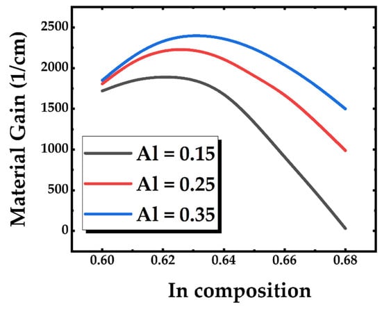 Figure 2 provides viable compositions of QWs that emit at 680 nm, but it remains unclear which combination of material is the best. To understand which combination of QW compositions is the best, the simulation of maximum material gain value under different QW combinations are shows in Figure 3. The simulation shows that a high aluminum composition of the QW barrier owns a high material gain at the same indium composition of the well. The reason can be attributed to the aluminum composition of the barrier accompanied by a high energy barrier, which makes the carriers stay in the quantum well easily. On the contrary, when the aluminum composition of the barrier is reduced, a large amount of carrier spillover causes partial radiative recombination that does not contribute to the gain. This phenomenon bring about a decreased differential gain []. Hence, a high energy barrier for lowering the transparent current density is a favorable option. Apart from the prudent choice of the barrier height, the indium composition of the well corresponding to different quantum well widths are another major factor affecting the gain. Figure 3 show that the change of the material gain compared to the indium composition of the well is not linear. Relative extremum can be observed at a specific indium composition of the well. Equation (14) can clearly explain this result. When the quantum well thickness is reduced, the material gain will increase due to the rise in the density of states. At the same time, the thinner well will also drop the difference of Fermi energy level between the energy level of the electron (hole), making (fj − fi) smaller. Therefore, when the thickness is reduced to a certain thickness, the QW will have a gain extreme value [].