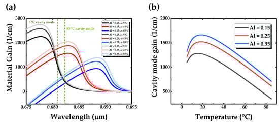 Since a VCSEL cavity has a specific resonant wavelength, the relative position of the QW gain peak and the cavity resonant wavelength is closely related to the threshold current. In addition, as shown in Figure 5a, the red shift rates of DBR and material gain are also significantly different. The 0.25 aluminum composition is used as the data example. The redshift rate of material peak wavelength is 0.1507 nm/°C, while the change of the cavity resonator wavelength with temperature is only 0.04 nm/°C. The material gain corresponding to the resonant wavelength will have a local extreme at different operating temperatures due to the difference in the red-shift rate between the two. The effect of local extrema also can be explained by Figure 5a. When VCSELs are operated at 5 °C, the cavity resonator wavelength is aligned on the right side of the peak of the material gain. However, the faster redshift rate of the material gain makes the material gain peak gradually across the cavity resonator wavelength. As the VCSEL operating temperature rises to 85 °C, the cavity resonator wavelength aligns to the left of the peak of the material gain. Hence, the local extrema of the cavity mode gain will appear at the temperature when the material gain peak and the cavity resonant wavelength align with each other. Figure 5b shows the relationship between temperature and cavity mode gain under different barrier aluminum compositions. Simulation results show that local extrema occur regardless of the QW composition conditions. In addition, the cavity mode gain is also very sensitive to changes in temperature. When the resonance mode moves away from the material gain peak, the cavity mode gain decreases rapidly. To make a VCSEL has the lowest threshold current at a specific operating temperature, a careful consideration of the gain to cavity offset is required during the VCSEL design flow.