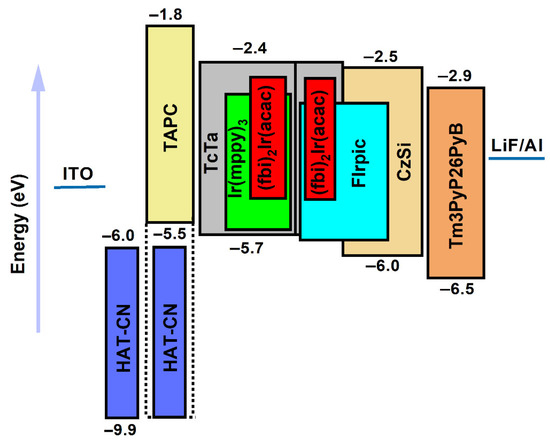 To enhance the utilization probability of excitions, realize 100% internal quantum efficiency and thus achieve white emission device with slow efficiency roll-off, it is crucial to deftly construct device structure by selecting suitable materials. As depicted in Figure 1, device configuration and HOMO/LUMO levels diagram, 1,4,5,8,9,11-hexaazatriphenylene hexacarbonitrile (HAT-CN) and LiF serve as anode and cathode interface modified layers to ameliorate the injection of holes and electrons, respectively [25]. We used p-type HAT-CN (0.2 wt%) doped into di-[4-(N,N-ditolyl-amino)-phenyl]cyclohexane (TAPC) and 1,3,5-tris(6-(3-(pyridin-3-yl)phenyl)pyridin-2-yl) (Tm3PyP26PyB) as hole transport layer (HTL) and electron transport layer to improve hole mobility from p-doping technology and achieve highly effective transport of electrons [26,27]. FIrpic, Ir(mppy)3 and (fbi)2Ir(acac) with high photoluminescent quantum yields (PLQYs) and matched energy levels were selected as three emitters [17,28,29]. For these three elements WOLEDs, 4,4’,4’’-tri(9-carbazoyl)triphenylamine (TcTa) and 9-(4-tert-Butylphenyl)-3,6-bis (triphenylsilyl)-9H-carbazole (CzSi) were chosen as the host materials for their complementary transport types [30,31]. The triplet energies (T1) of TcTa and CzSi are 2.83 and 3.02 eV, respectively, while those of (fbi)2Ir(acac), Ir(mppy)3 and FIrpic are 2.20, 2.38 and 2.62 eV, respectively. In this case, the T1 of TcTa and CzSi are more than adequate to restrict triplet excitons on emitter molecules and hinder from the back transmission of triplet exciton energy from emitter to host. Thus, using TcTa as the host of EML1 and EML2 is beneficial for the transmission of holes. The utilization of bipolar host CzSi helps to facilitate carriers’ balance and broaden recombination zone. The structures of FIrpic, Ir(mppy)3, (fbi)2Ir(acac), and other organic functional materials used in these WOLED are given in Scheme S1.