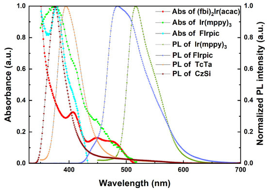 Absorption spectra of (fbi)2Ir(acac), Ir(mppy)3, FIrpic and PL spectra of Ir(mppy)3, FIrpic, TcTa and CzSi measured in CH2Cl2.