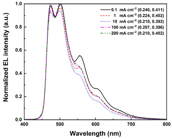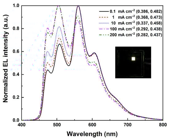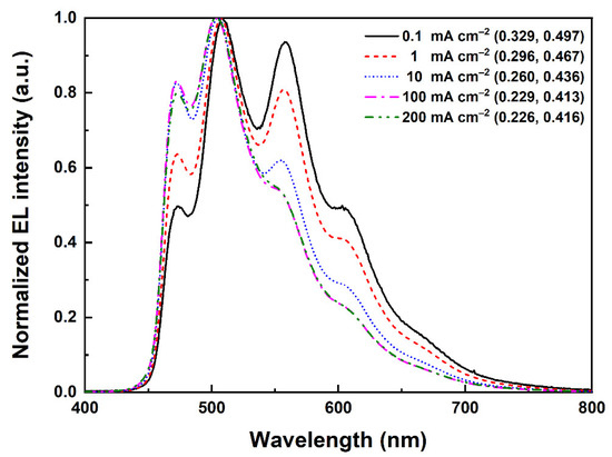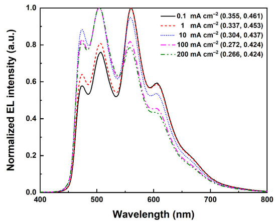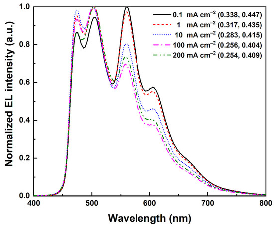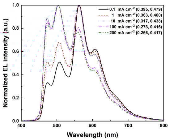 Continuously, the doping concentrations of (fbi)2Ir(acac) within EML1 and EML2 were modulated to be 2.4 wt% and 0.6 wt%, respectively, and the obtained device was defined as Device W4. As shown in Figure 6, the intensity ratios of blue and green emissions in Device W4 were higher than those of Device W3, while the intensity ratio of red emission decreased in some degree compared with Device W3. The CIE coordinates of Device W4 is (0.283, 0.415) at 10 mA cm−2. Finally, based on Device W4, the concentration of (fbi)2Ir(acac) within EML1 was modulated to be 3.0 wt%, and the obtained device was defined as Device W5. With the increment of current density, as illustrated in Figure 7, the intensity ratios of blue and green emissions have no marked change, while the intensity ratio of red emission dropped gradually. CIE coordinates of Device W5 is (0.211, 0.388) at 10 mA cm−2.