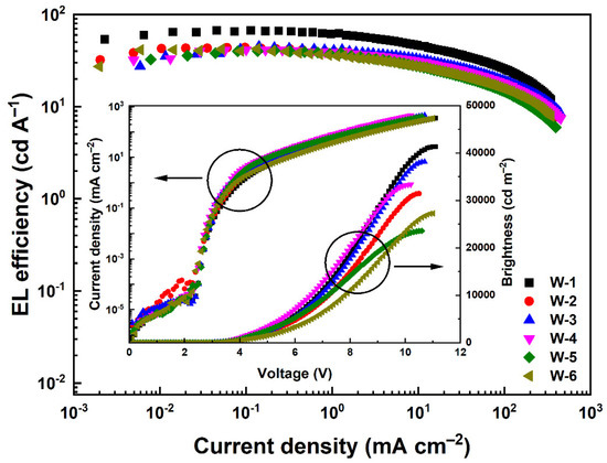EL efficiency-current density (η-J) characteristics of devices W1-W6. Inset: Current density-brightness-voltage (J-B-V) characteristics of devices W1-W6.