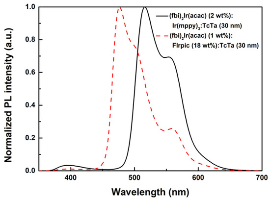 Normalized PL spectra of 30 nm (fbi)2Ir(acac) (2 wt%):Ir(mppy)3 (10 wt%):TcTa film and 30 nm (fbi)2Ir(acac) (1 wt%):FIrpic (18 wt%):TcTa film.