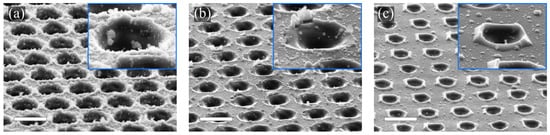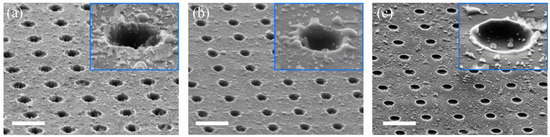 SEM image of GaSe surface with ARMs, inscribed at E = 37.5 nJ and numbers of pulses: 8 (a), 3 (b), and 1 (c). Scale bar—3 μm. One of the craters is shown separately in the upper right corner of each image.