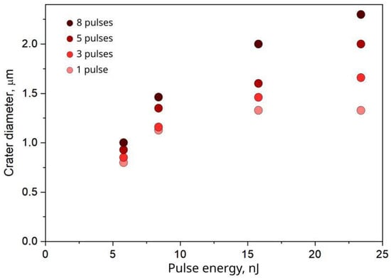 Dependence of crater diameter on pulses of energy E = 5.8, 8.4, 15.8, and 23.4 nJ and numbers of pulses N= 1, 3, 5, 8. For each energy, four diameter values corresponding to pulse numbers N = 1, 3, 5, and 8 are given (from bottom to top).