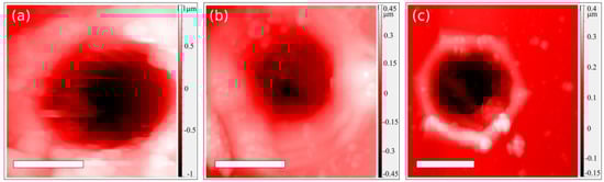 Surface topography of a single crater inscribed at E = 37.5 nJ and numbers of pulses: 8 (a), 3 (b), and 1 (c). Scale bar−1 μm.