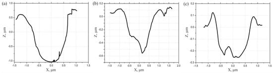 The profiles along the center of a single crater inscribed at E = 37.5 nJ and pulse numbers 8, 3, 1 were obtained from 2D surface topography and presented in Figure 7. The depth of the crater increased from 0.3 μm at the impact of one pulse to 0.7 μm at impact of 3 pulses and to 1.7 μm at impact of 8 pulses. Moreover, in the case of single pulse impact, the height of the crater rim was measured, and it equaled to ≈100 nm. Thus, the increase in the number of pulses used for the creation of a single crater led to an increase in the depth of the crater, resulting in more effective antireflective spectral properties of ARM in this case.