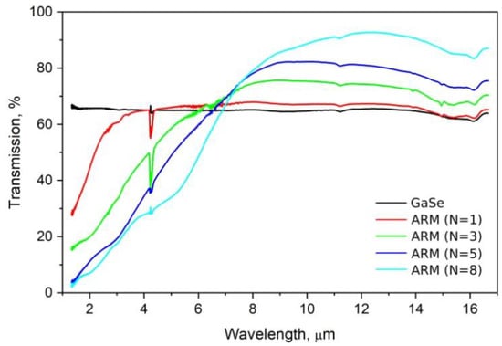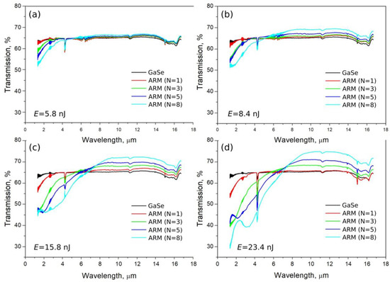 The measured transmission in the mid-IR spectral range of a freshly cleaved GaSe sample was around 65% and could be increased by an inscription of ARM. For this purpose, various ARM structures were inscribed on the GaSe sample at different pulses of energy (E = 5.8 nJ, 8.4 nJ, 15.8 nJ, and 23.4 nJ) and numbers of laser pulses used for the creation of a single crater (N = 1, 3, 5, 8). The obtained transmission spectra of ARMs are presented in Figure 8 in comparison with the initial transmission spectrum of a GaSe monocrystal (black line on the Figure 8).