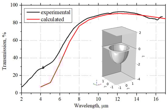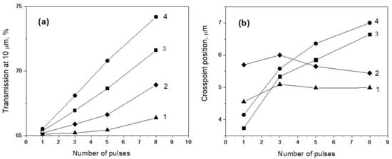 Simulation results are shown at Figure 16. They qualitatively corresponded to experimental data, depending on the number of pulses: transmittance rapidly decreased in the shortwave region and increased in the longwave region. However, transmittance for wavelengths above 7 µm was higher in the experiment than in the simulation for the corresponding number of pulses. Geometry of ablation craters did not fully define the optical property of the structure. More likely, laser pulse impacts additionally caused change to the refractive index on the crystal surface due to changes of chemical composition, for example, the formation of a thin Ga2O3 layer [], which has a refractive index of about 1.88 [], leading to an increase in transmittance.