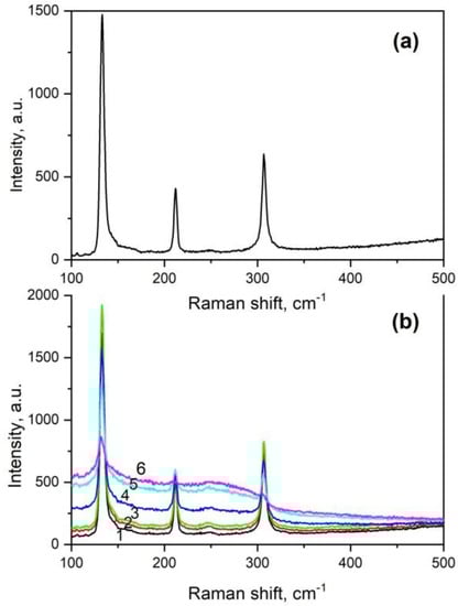 Figure 11 shows the Raman spectrum for a freshly chipped GaSe (a) crystal and for GaSe with an ARM, in the ARM region. The spectrum corresponded well to the Raman spectrum for ε-GaSe []. The ε-GaSe has two out-of-plane phonon modes, A11G at ~133 cm−1 and A21G at ~307 cm−1, and one in-plane E22G mode at ~212 cm−1, in line with previous reports []. Thus, the noncentrosymmetric polytype ε-GaSe, which has a very high χ coefficient, is predominant in grown GaSe. It can be seen that the application of an ARM on the GaSe surface led to a weakening of the intensity of narrow lines in the Raman spectrum, and the degree of attenuation increased as the energy in the pulses increased, as well as with an increase in their number from 1 to 8 (Figure 11). At the same time, a solid background appeared and intensified under the linear Raman spectrum: in the extreme case (at maximum energy per pulse), the linear spectrum completely passed into a solid background associated with an amorphous GaSe that appeared as a result of laser ablation on the surface of the GaSe crystal.