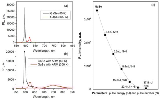 PL spectra for GaSe (a) and GaSe with an ARM (b) measured at 300 K (red line) and 80 K (black line) at 532 nm excitation. (c) The dependence of the intensity of the main PL line (at T = 80 K) on the parameters of laser pulses (energy per pulse and the number of pulses for the creation of one crater in an ARM at GaSe).