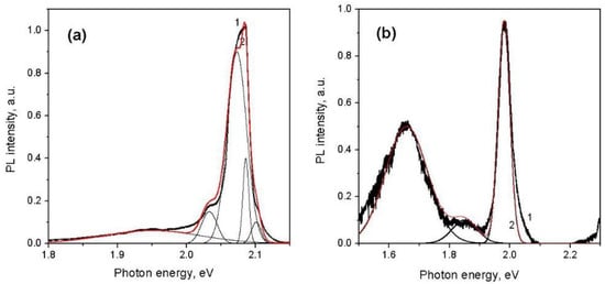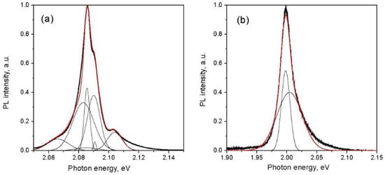 PL spectra for the GaSe crystal obtained at an excitation of 532 nm, at 80 K (a) and 300 K (b). Thick black lines show the experimentally measured PL spectrum, thin black lines show the Gaussian components, and a thick red line shows the sum of these components.