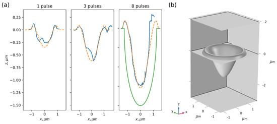 (a) AFM profiles of ARM craters inscribed with an energy of 37.5 nJ and a different number of pulses (solid) and 4th order approximations (dashed). Semi−ellipsoidal modification assumption for 8 pulses (green); (b) the model’s geometry: upper layer−air, lower layer−GaSe.