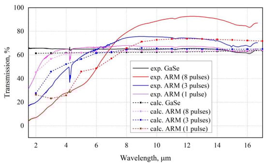 In conclusion, large single crystals of GaSe were grown by the Bridgman–Stockbarger method. Using optical spectroscopy (Raman, absorption, luminescence), the obtained GaSe crystals were attributed to a non-centrosymmetric ε modification. The appearance of free exciton lines and the absence of impurity bands in low-temperature PL spectra indicated the high quality of our crystals, both in composition and structure. Using femtosecond laser pulses of 1026 nm, with an energy in the range of 5.8–37.5 nJ and the number of pulses from 1 to 8, periodic ARMs were inscribed on the surface of the cleaved plates of a nonlinear optical crystal of GaSe. After the ARM fabricating and ablating part of the GaSe material, a solid background associated with an amorphous substance on the plate surface appeared in the Raman spectrum of GaSe. The narrow line in the low-temperature PL spectra broadened and weakened in intensity, whereas an additional broad band of about 750 nm, related to amorphous selenium, appeared. An increase in the transmission in the mid-IR from 65% to 80% for an ARM fabricated on one side and up to 94% for ARMs fabricated on both (opposite) sides was shown. The transmission increase of 29% compared to unmodified GaSe was demonstrated, which significantly exceeded the result of previous work −8% []. Based on surface 2D profiles of the craters in the ARMs obtained by atomic force microscopy, the transmission spectra for GaSe with ARMs were numerically calculated. A good quantitative agreement between the experimental and calculated data (spectra) was obtained under the assumption of changes in the composition of the ablated material. The obtained results on an increased transmittance of nonlinear optical crystals based on ARMs provides a route towards the development of high-power mid-IR lasers, efficient high-harmonic generators, and optoelectronic devices.