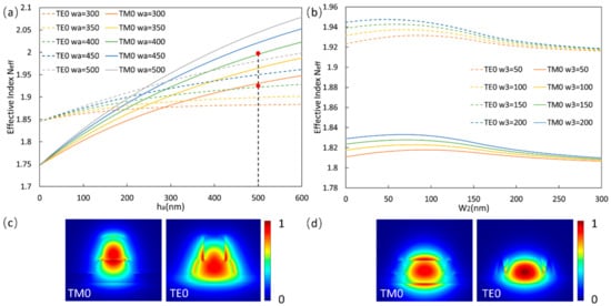 When the nanowires are loaded on LN WGs, the electric fields of TE polarization (whose main electrical field is horizontal) and TM polarization (whose main electrical field is vertical) will be affected differently. Figure 2a shows the Neff of and in assisted LNWG at the wavelength of 1.55 μm. We use Lumerical Finite Difference Eigenmode (FDE) solver to calculate their Neff. In the calculation, is fixed at 600 nm. It can be seen that for both polarizations, Neff increases with and . However, with the increase of , Neff of will approach and exceed Neff of eventually. According to Figure 2b, we choose (, ) = (400, 500) nm, to match the Neff of of grooved WG (~1.93), and to significantly increase Neff of . Figure 2c shows the relevant electric field distribution of and modes in the case of (, ) = (400, 500) nm.