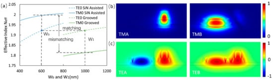 When the LN WGs are grooved, and will also be affected differently. Figure 3a shows the Neff of and modes in grooved LNWG at 1.55 μm wavelength. We also use the Lumerical FDE solver to calculate their Neff. In the calculation, is fixed at 1μm. And we assume that when is narrow, WG cannot be etched completely, but small pits are formed on the WG []. It can be seen that for both modes, Neff of grooved waveguide first increases and then decreases with the increase of , and gradually approaches Neff of single-mode WG with the width . So it is convenient for us to design Neff of TE polarization. According to Figure 3a, we select (, ) as (200, 100) nm to exact match Neff of mode. Figure 3b shows the electric field of and modes in the case of (, ) = (200, 100) nm.
