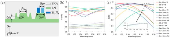 The manufacturing tolerance is considered of four parameters, that is, (1) Etching depth error of grooves on LN film δh, (because narrow grooves are difficult to etch), (2) the sidewall angle of WGs δθ, (3) width of WGs δw (assuming that the two WGS have the same change), (4) mask misalignment δm (mask misalignment will cause the horizontal position of nanowires to shift). And Figure 5 shows the transmission spectrum of the corresponding parameters deviating from the optimized value. For both polarizations, When the range of δh/δθ/δw/δm is 30 nm/±3°/±20 nm/±30 nm, ER > 10 dB and IL < 0.5 dB of and ER > 40 dB and IL < 0.05 dB of can still be maintained in the 160 nm bandwidth. It is worth noting that is much less sensitive to fabrication errors and wavelength changes than , which is caused by the large phase mismatch of .