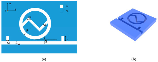 In the “COMSOL Multiphysics 5.4 Stockholm, Sweden” software, we selected the model wizard interface and built the 2D model, as shown in Figure 1a. We constructed the 3D rendering in “3d Max Montreal, Canada”, as shown in Figure 1b. The marks define the following parameters in the corresponding figure, where R is the radius of the outer ring of the circle, L is the distance between the upper and lower Z-structure, O is the angle of the opening of the Z-structure, G is the coupling distance between the MIM waveguide with short double tubes and the IZRR structure, M is the width of the short tube, H is the height of the short tube, and ω is the distance between the MIM waveguide. In order to ensure that the SPPs at the upper and lower interface of the waveguide could be coupled, we set at a constant value of 50 nm in this paper [24].