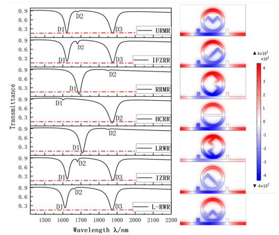 The asymmetry of the IZRR structure causes the Fano resonance splitting phenomenon. There are various types of symmetry and asymmetry that need further discussion. Is the primary influence of the systematic Fano resonance splitting phenomenon the left-right asymmetry of the structure, or the top-bottom asymmetry of the structure? Or, for IZRR structures, is the top-bottom, as well as the left-right asymmetry, the main factor? On this basis, we discuss the following derivative structures below: the upper ring with an M-shaped resonator (URMR); the lower ring connected with a W-shaped resonator (L-RWR); the internal-flipped Z-ring resonator (IFZRR); the left ring connected with a W-shaped resonator (LRWR); and the right ring connected with an M-shaped resonator (RRMR). In addition to the above, we introduce a horizontal-channel ring resonator (HCRR), with left and right, as well as upper and lower symmetry, for the convenience of comparison. Finally, the IZRR structure in this paper is combined with the above six structures to draw the transmission curve, as shown in Figure 3 below. On the far right is a plot of the field strength distribution for D2 or D3, with the red line being the contour of the 0.15 transmittance.
