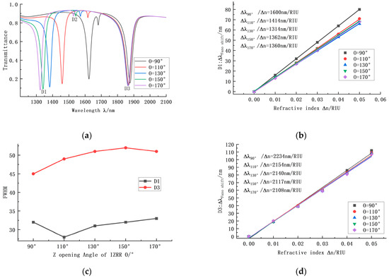 In order to further determine the IZRR structure with the best performance, we first changed the Z-structure angle, O, of the IZRR structure and set it to 90°, 110°, 130°, 150°, and 170°, successively. The transmission, sensitivity, and bandwidth curves were obtained, as shown in the figure. According to Figure 4a, with the increase in angle, the first trough moved to the right, but the transmittance increased significantly. In Figure 4b, it can be seen that the system’s overall sensitivity showed a downward trend. In Figure 4c, it can be seen that the range of bandwidth change is small at this time, so the value will decrease. The system always has high transmittance at the D2 trough, so the trough at D2 was not analyzed. Finally, we analyzed the D3 trough. As the angle increases, the transmission curve does not change much but, obviously, the bandwidth at 90° is smaller than the bandwidth at other angles. According to Figure 4d, the system’s sensitivity at 90° is also at the maximum. Based on the above analysis of D1 and D3, the system’s overall performance at 90° is the best, so the angle of the Z opening in the IZRR structure is finally determined to be 90°.