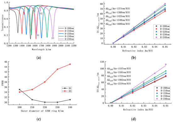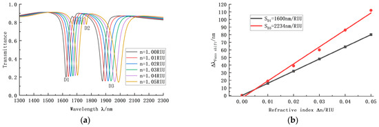 We successively set the refractive index of the system as 1.00, 1.01, 1.02, 1.03, 1.04, and 1.05 and drew the spectral transmission lines shown in Figure 8a,b. With an increase in refractive index, the shape of the curve was constant, but the positions of all three troughs were steadily shifted back. Among them, the D1 trough and the D3 trough had good transmission performance. Finally, at the D1 trough of the IZRR structure, the sensitivity of the refractive index sensor reached 1600 nm/RIU, the transmittance was 0.198, the bandwidth was 31, and the quality factor was 51, 61. At the D3 trough, the sensitivity of the refractive index sensor was further improved to 2234 nm/RIU, the transmittance was 0.156, the bandwidth was 45, and the quality factor was 49.65.