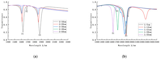 In addition to the radius, R, and the Z-structure opening angle, O, the coupling distance, G, and the distance between the upper and lower Z-structure in the IZRR structure also significantly influence the sensing performance. Firstly, the transmission conditions when G is 10 nm, 20 nm, 30 nm, 40 nm, and 50 nm were analyzed, as shown in Figure 6a. The curve’s trough position remains unchanged as G increases. However, the curve tends to smooth out, the narrowband effect of the system continues to weaken, and the broadband effect increases significantly; this is a manifestation of the weakening of the Fano resonance. The sensing performance of the system decreases substantially. Therefore, we should choose the smaller G value so, in this paper, we selected G = 10 nm. We then set L to 35 nm, 28 nm, 21 nm, 14 nm, and 7 nm, successively, to obtain the transmission curve shown in Figure 6b. It can be seen from the figure that, in the first four cases when L is not equal to 35 nm, the transmission performance of trough 2 is reasonable; when L = 35 nm, the transmission performance of troughs 1 and 3 is good. The sensitivity and bandwidth of the two cases were the same. In order to allow more environmental measurements, the realization of the multi-interval detection function is another outstanding advantage of the resonant splitting mode, so we finally chose L = 35 nm.