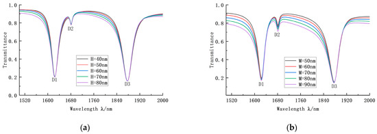 The above structural parameters have an apparent influence on the sensing performance of the system; it is the influence of the IZRR structure itself. Next, we explored the influence of a waveguide with a short double tube on the transmission performance of our structure. Varying the width and height of the short tubes, independently and in turn, gives the transmission curves shown in Figure 7 The curves coincide and the central gap occurs in the broadband part, which has little influence on the narrowband Fano resonance. Therefore, it is possible to directly select the appropriate parameters and we consequently selected H = 80 nm and M = 50 nm.