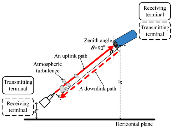 The signal beam propagating in the satellite–ground field (i.e., Figure 1) is less affected by atmospheric turbulence than the ground–ground communication links. The signal beam propagates through the atmosphere through an uplink or downlink path to reach the receiving terminal, as shown in Figure 1. The distance from the ground to the lower terminal and the vertical height of the receiving terminal, as illustrated in Figure 1, are h0 and H, respectively. θ is the path zenith angle. The uplink and downlink transmission paths of the signal beam distorted by turbulent atmosphere are indicated by the red solid and dotted lines, respectively.
