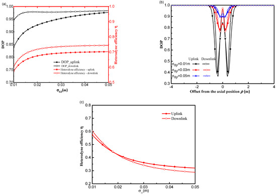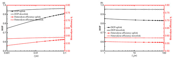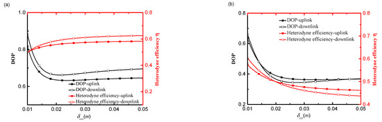 Figure 4a–d show heterodyne efficiency and DoP as a function of δSxx, δSyy, δSxy and δSyx of an uplink and downlink path, respectively. As seen in Figure 4a, heterodyne efficiency increases and the DoP of the signal beam on-axis points decreases with an increase in δSxx. The heterodyne efficiency and DoP of the signal beam propagation on a downlink path are higher than on an uplink path. That is because the difference between uplink and downlink affected by atmospheric turbulence is expressed in the turbulence term M3 in Equation (7), i.e., M3 of a downlink transmission is less than that of an uplink transmission. The heterodyne efficiency and DoP on a downlink and uplink path decrease with an increase in δSyy, which is consistent with the results presented in Figure 2c. The heterodyne efficiency of a downlink path is lower than that of an uplink path when δSyy reaches a certain value. Namely, the variation of heterodyne efficiency of a downlink and uplink path is increased with an increase in δSyy. As seen in Figure 4c,d, heterodyne efficiency remains consistent as δSxy and δSyx increase, but the DoP of the on-axis points increases with an increase in δSxy and δSyx. The heterodyne efficiency and DoP of a downlink path are higher than that of an uplink path. This demonstrates that the coherence length of the signal beam in the xy (or yx) direction component has a significant effect on the DoP, but is less sensitive with regard to heterodyne efficiency. Generally, δSyy has the most significant effect on the heterodyne efficiency and DoP of the signal beam propagation on a downlink and uplink path.