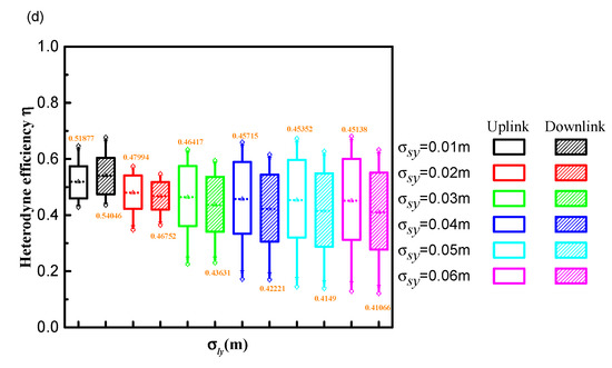 Figure 3a,b show the heterodyne efficiency as a function of σlx for various σsx and σsy of the uplink and downlink path, respectively. Figure 3c,d show the heterodyne efficiency as a function of σly for various σsx and σsy of the uplink and downlink path, respectively. In Figure 3a–d, the top and bottom symbols in each box represent the maximum and minimum values, respectively. The mean value is indicated by the number at the top or bottom of each box. Comparing Figure 3a,c, heterodyne efficiency increases with increasing σlx and σly, respectively. Heterodyne efficiency on the downlink path is higher than on the uplink path in Figure 3a,c. Additionally, the waist radius of the LO beam in the x direction component σlx has a relatively strong effect on the heterodyne efficiency. Comparing Figure 3a,b, heterodyne efficiency improves and decreases with increasing σSx and σSy, respectively. Finally, heterodyne efficiency eventually stabilizes. When σsy ≤ 0.02 m, heterodyne efficiency is higher for a downlink path than for an uplink path, as shown in Figure 3b,d. However, when σsy is larger than 0.02 m, the heterodyne efficiency of the downlink path is lower than that of the uplink path. That is because the degree of mismatch between the signal beam and the LO beam increases as σsy increases, which has a greater impact than the effect of the turbulence term on an uplink and downlink path. Comparing Figure 3c,d, heterodyne efficiency improves and decreases with increasing σSx and σSy, respectively, which is consistent with the results presented in Figure 3a,b.