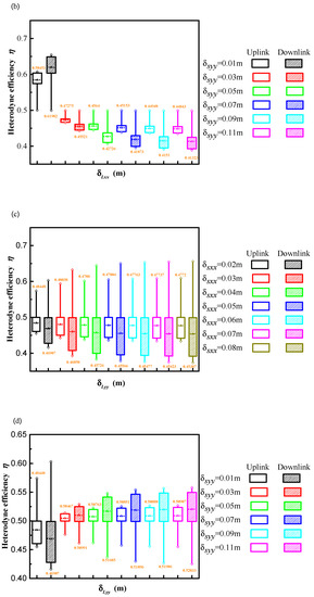 Figure 5a,b show the heterodyne efficiency as a function of δLxx for various δSxx and δSyy of the uplink and downlink path, respectively. Figure 5c,d show the heterodyne efficiency as a function of δLyy for various δSxx and δSyy of the uplink and downlink path, respectively. In Figure 5a–d, the top and bottom symbols in each box represent the maximum and minimum values, respectively. The mean value is indicated by the number at the top or bottom of each box. With increasing δSxx and δSyy, heterodyne efficiency improves and decreases, respectively, as seen in Figure 5a,b. Finally, the heterodyne efficiency eventually stabilizes. The heterodyne efficiency on the downlink path is also higher than that on the uplink path in Figure 5a. As demonstrated in Figure 5b, the heterodyne efficiency is higher for a downlink path than for an uplink path when δSyy < 0.03 m, and when δSyy ≥ 0.03 m, the heterodyne efficiency for a downlink path is lower than that for an uplink path. Additionally, this change of heterodyne efficiency of the downlink and uplink paths is increased with an increase in δSyy. Comparing Figure 5a,c, the heterodyne efficiency decreases and increases with increasing δLyy and δLxx, respectively. The heterodyne efficiency on the downlink path is also lower than that on the uplink path in Figure 5c, which is an opposite trend to the results presented in Figure 5a. The reason has been explained by analyzing the results of Figure 3. Therefore, compared with the effect of δSxx on the heterodyne efficiency, the coherence length of the signal beam in the yy direction component δSyy has an opposite trend to the heterodyne efficiency for a downlink path and an uplink path. The comparison of the results of Figure 5b,d can also demonstrate the correctness of this conclusion.